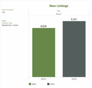 NWMLS brokers added 9,161 new listings in March 2025, a year-over-year increase of 14.1% compared to March 2024 (8,028). When compared to February 2025, new listings increased by 44.4%, with 6,346 listings added.