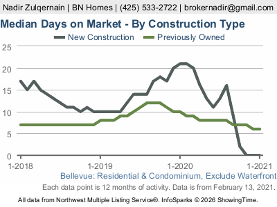What is my home worth? This question is the first step when people start to think about selling their house. Having the most current and up-to-date data about recent activity is crucial to answering this question. This blog post is unique. It includes live graphs that show you the last twelve months’ data for Redmond, Sammamish, Kirkland, and Bellevue. If you require more extensive data, please reach out and we will get you what you seek. A broader picture shows that the demand for homes increased significantly starting in the summer, while the supply went down a lot, mostly due to homeowners are not eager to sell during COVID-19 unless there is a dire need to do so.